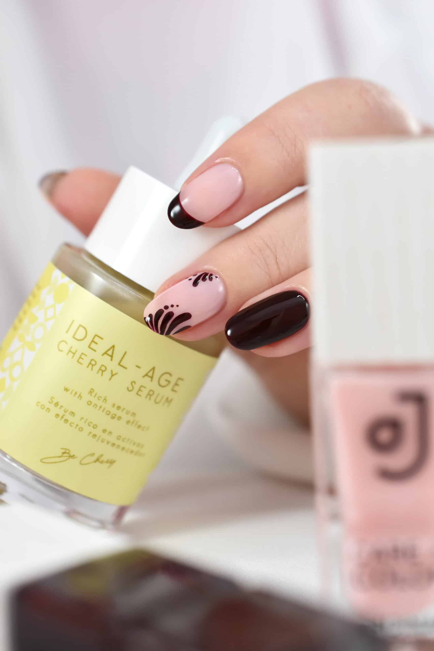 Le sérum antiage à l’acide hyaluronique et au bakuchiol, s’applique matin et soir tous les jours sur peau nettoyée.  Appliquez 2 couches de vernis à ongles Fleur de cerisier ou cerise. Notre vernis à ongles est un vernis soin contenant un actif breveté à base de céleri français et un extrait de fruit.